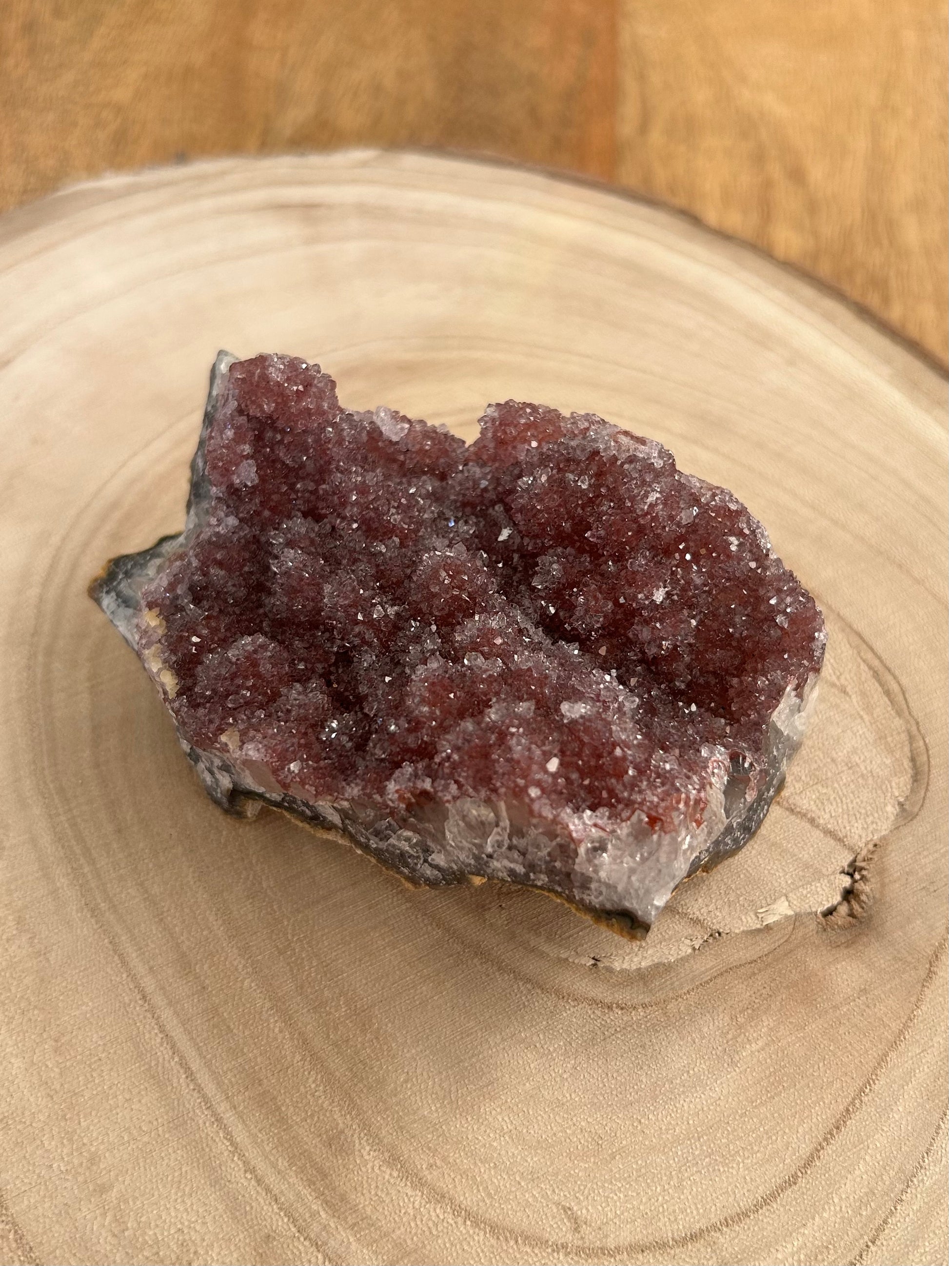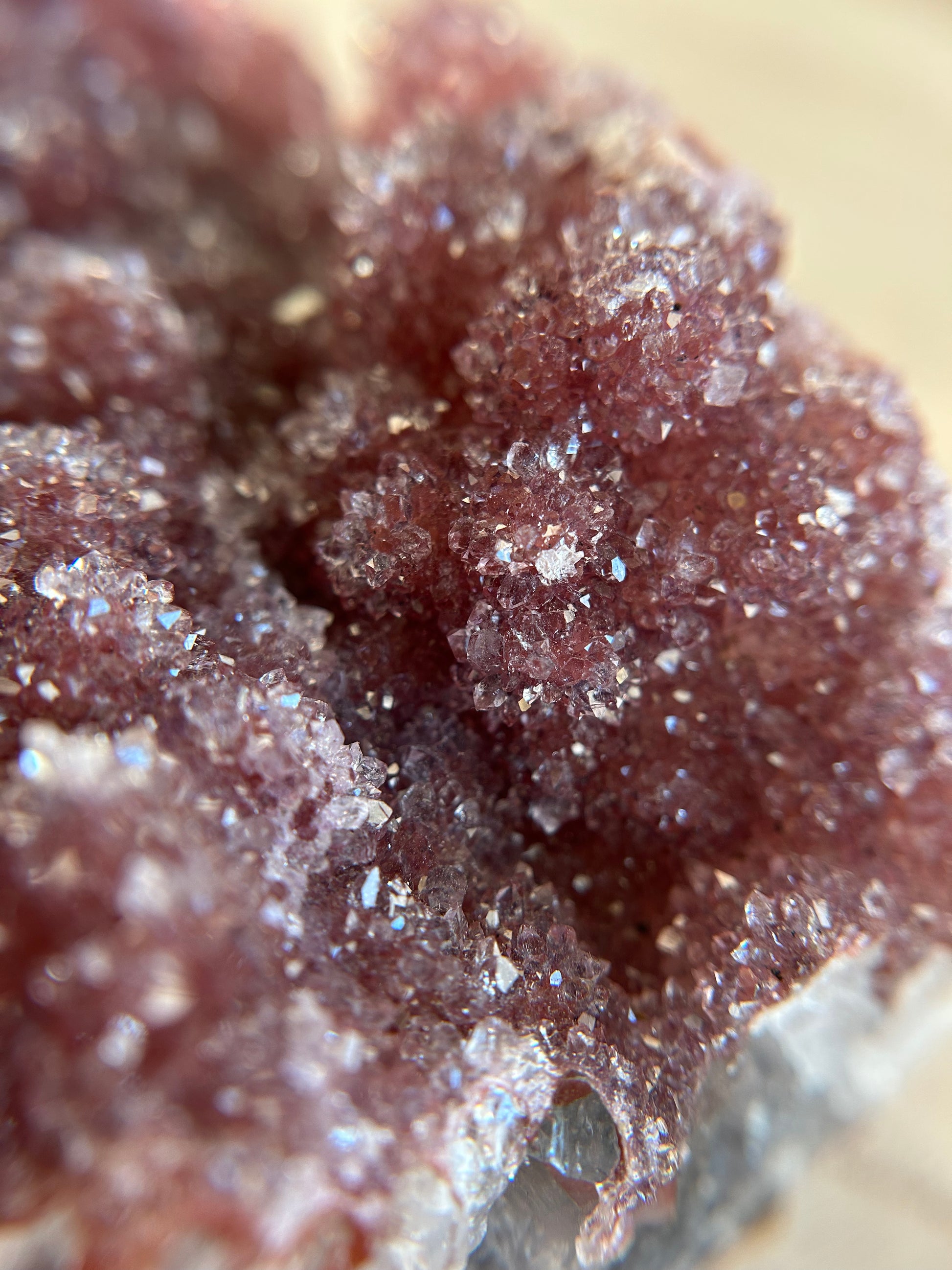 Diese Amethyst-Stufe hat besonders schöne, dunkelrosa Farbtöne und viele kleine Spitzen.