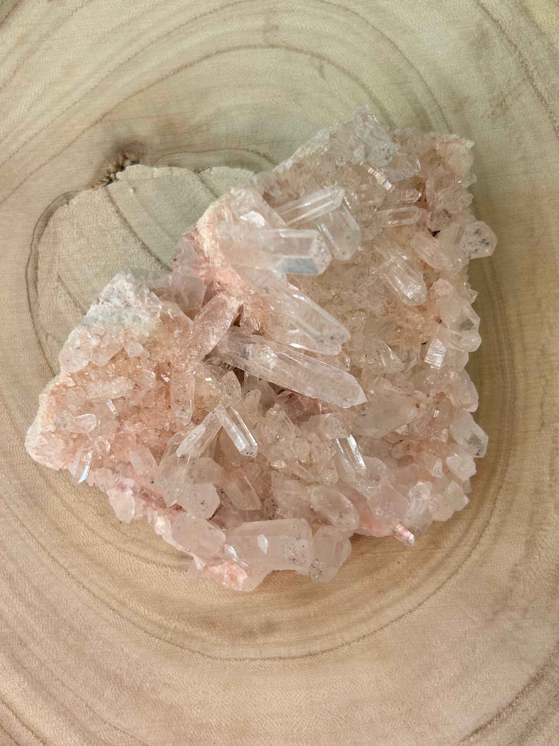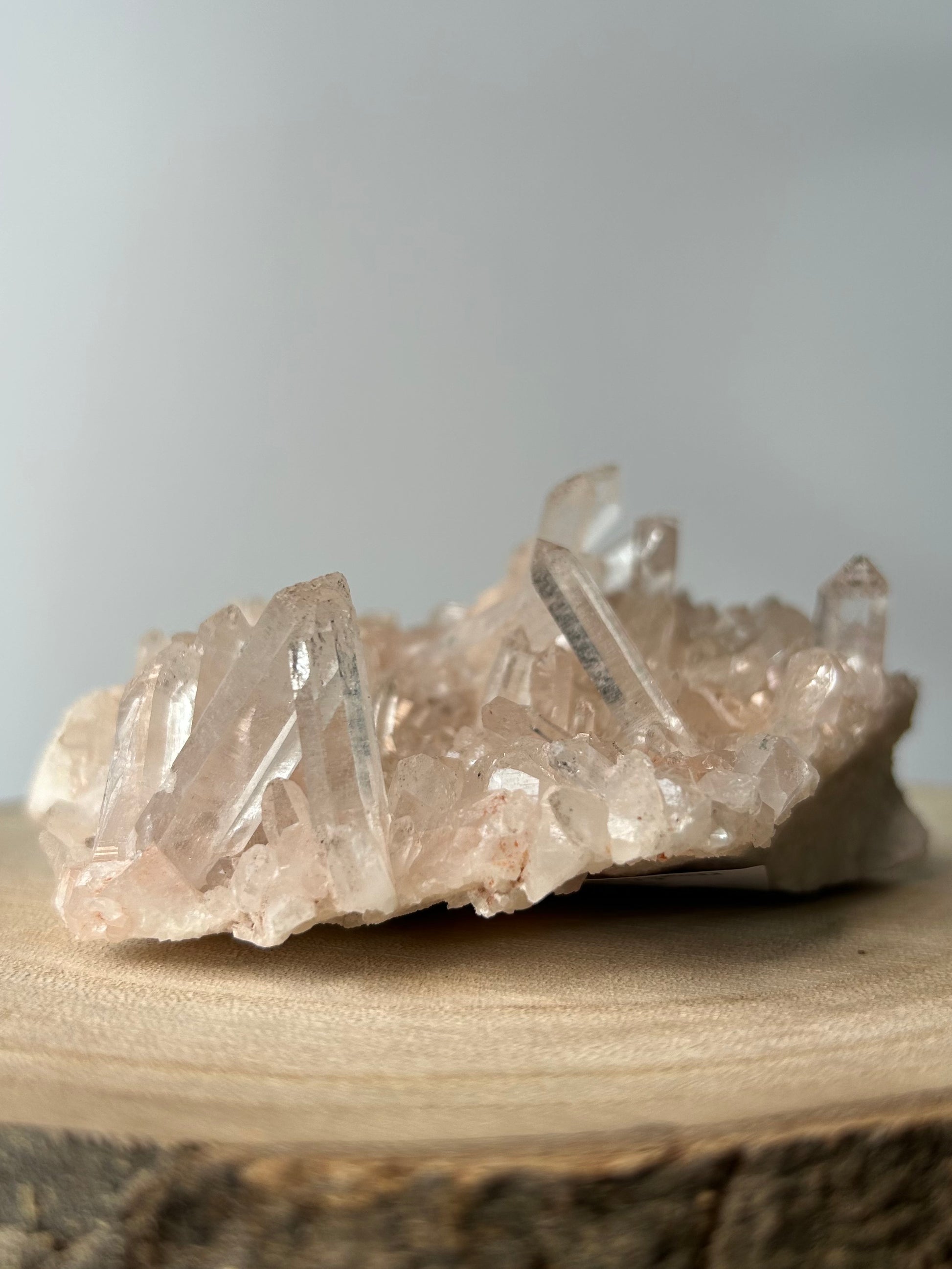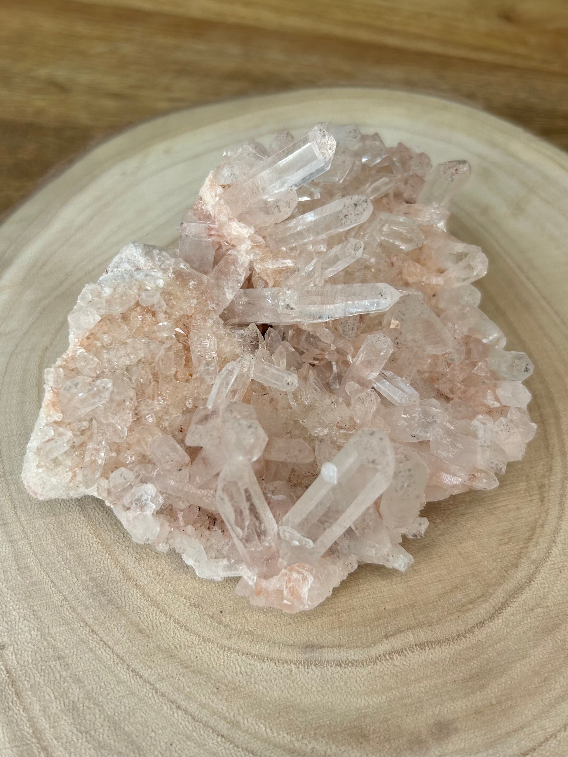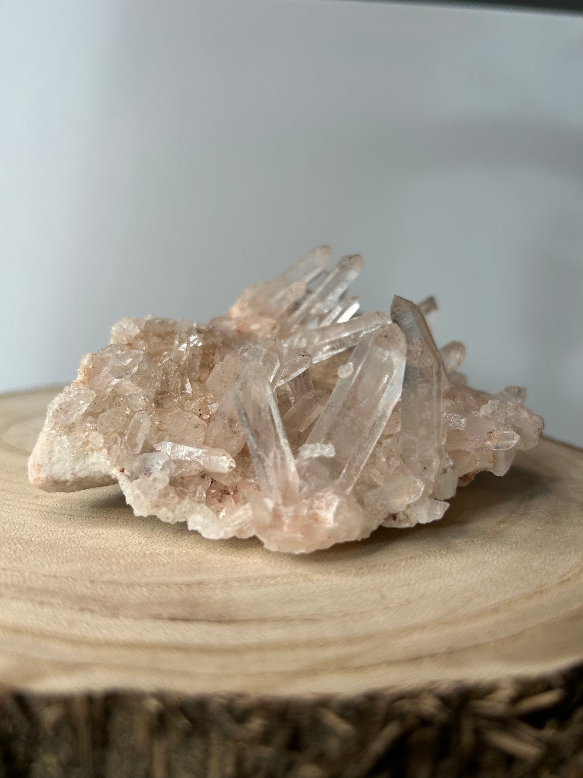 Diese Bergkristall-Stufe hat einen zarten rosa Farbton und wunderschöne Spitzen.