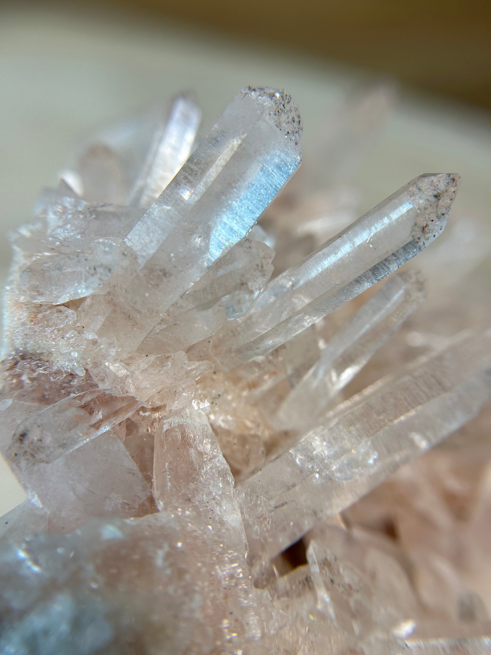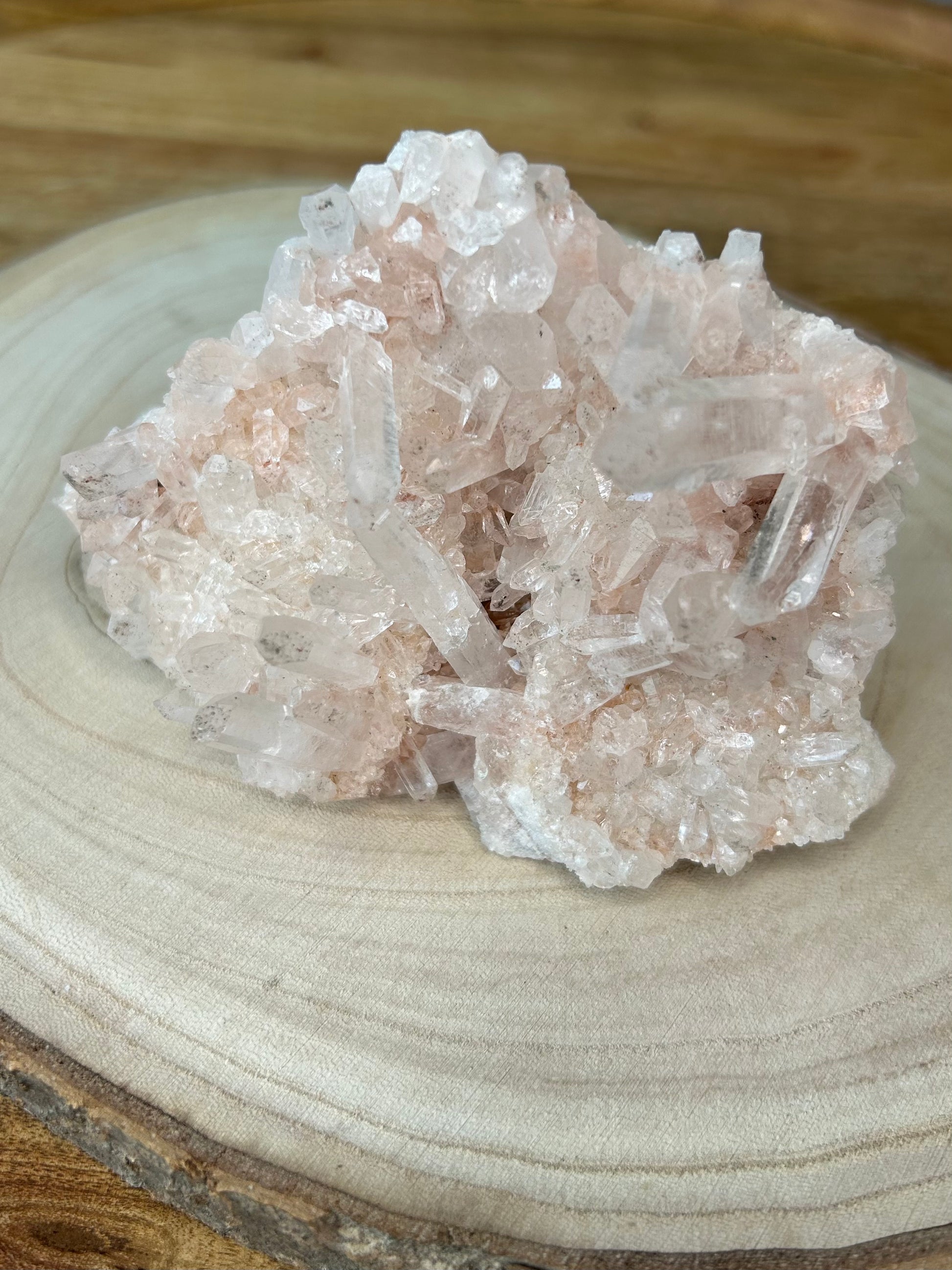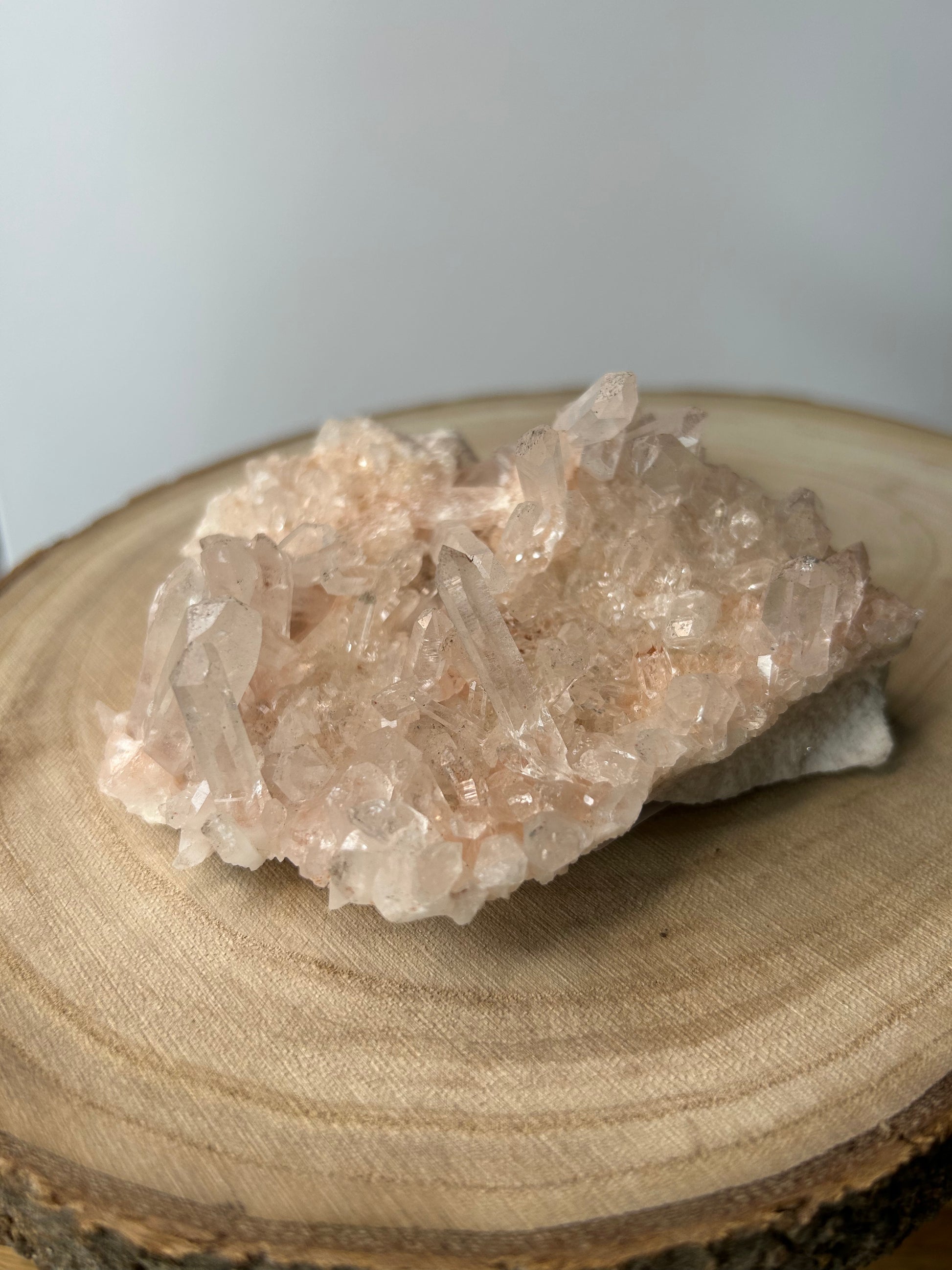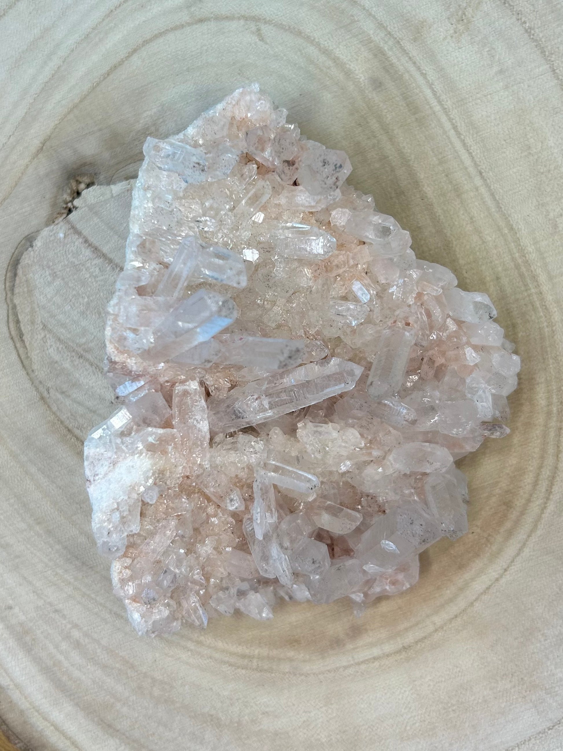 Diese Bergkristall-Stufe hat einen zarten rosa Farbton und wunderschöne Spitzen.