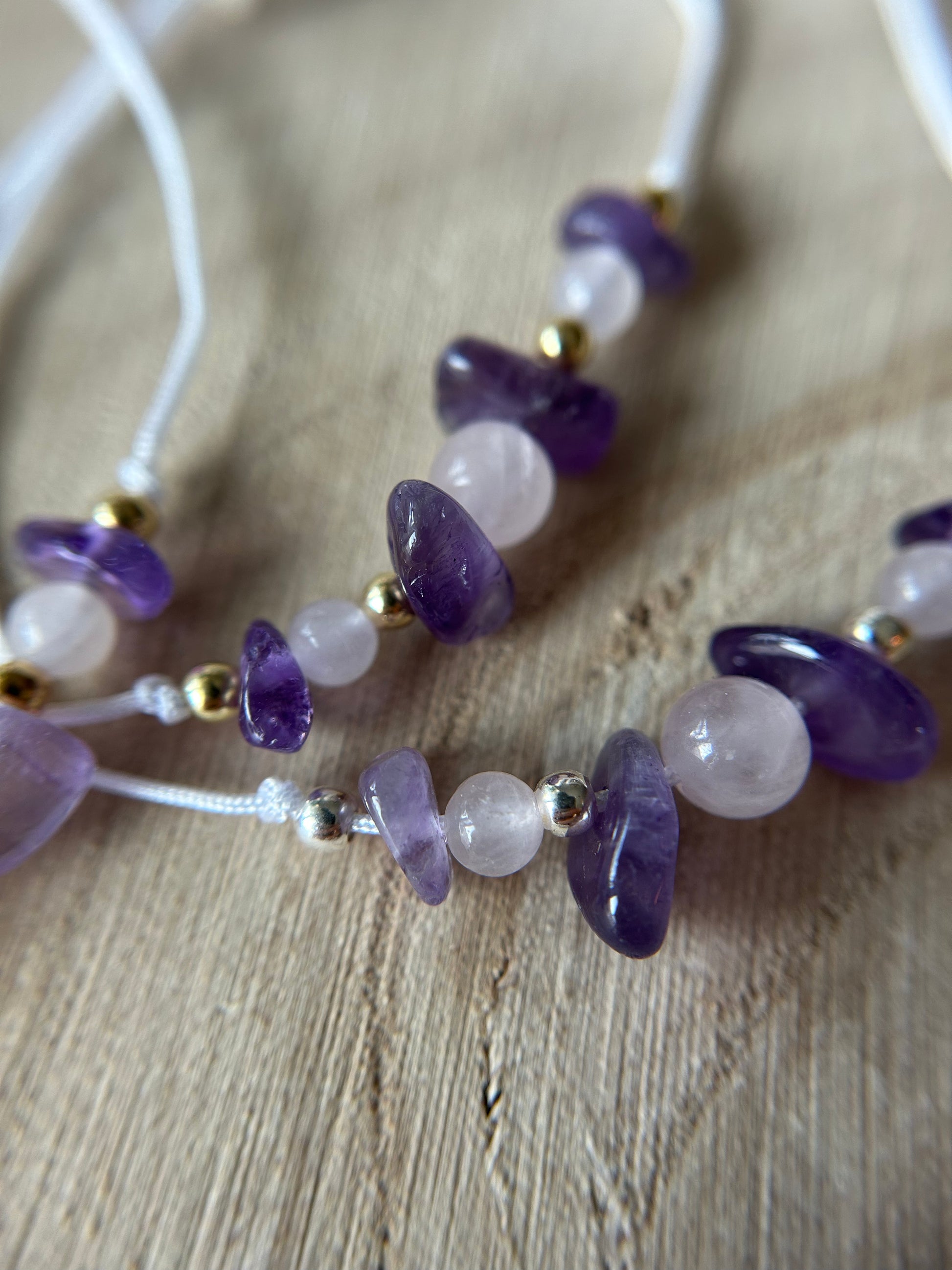 Material: Rosenquarzperlen, Amethystsplitter, Perlen aus 925er Silber oder vergoldetem 925er Silber