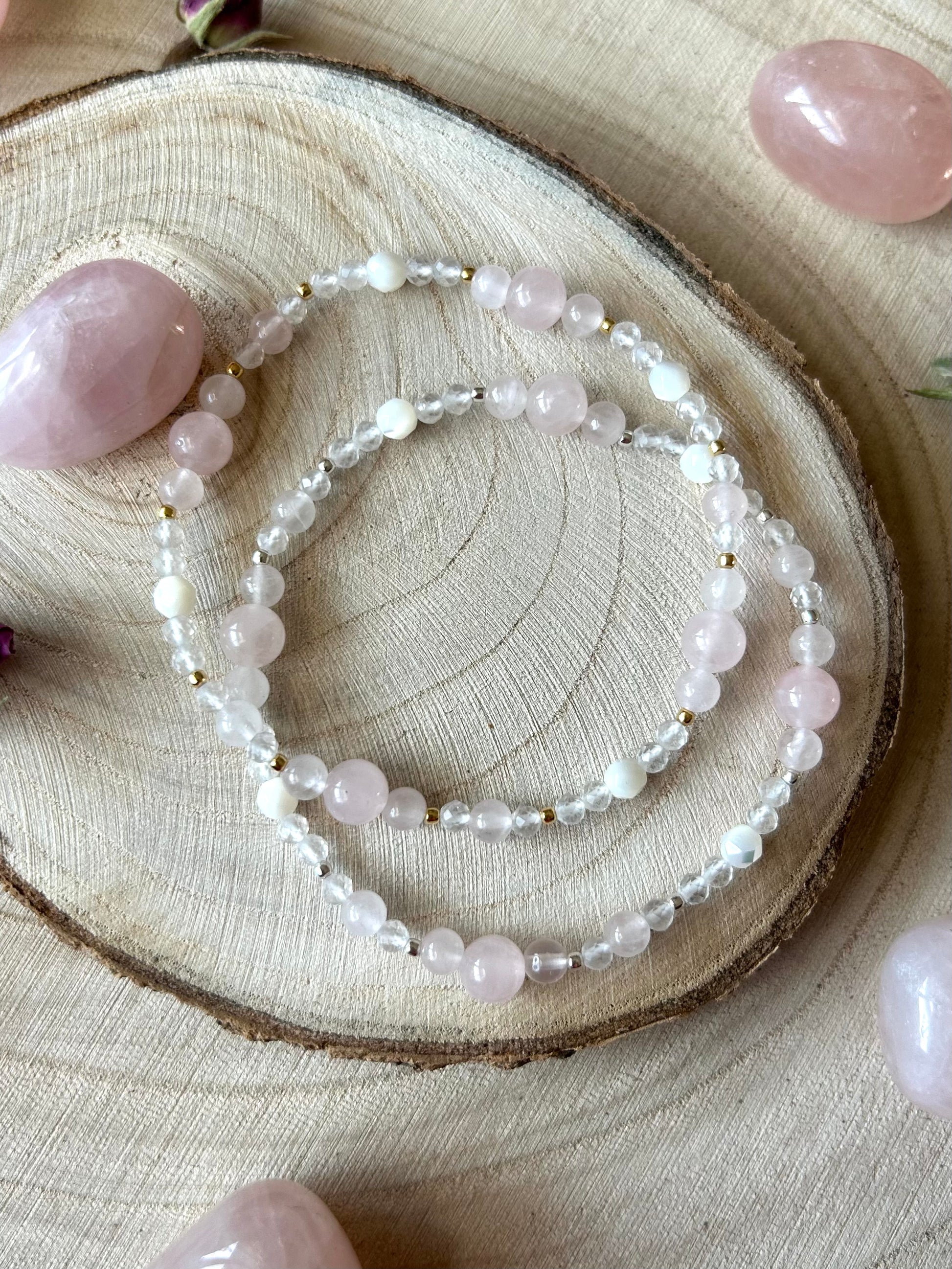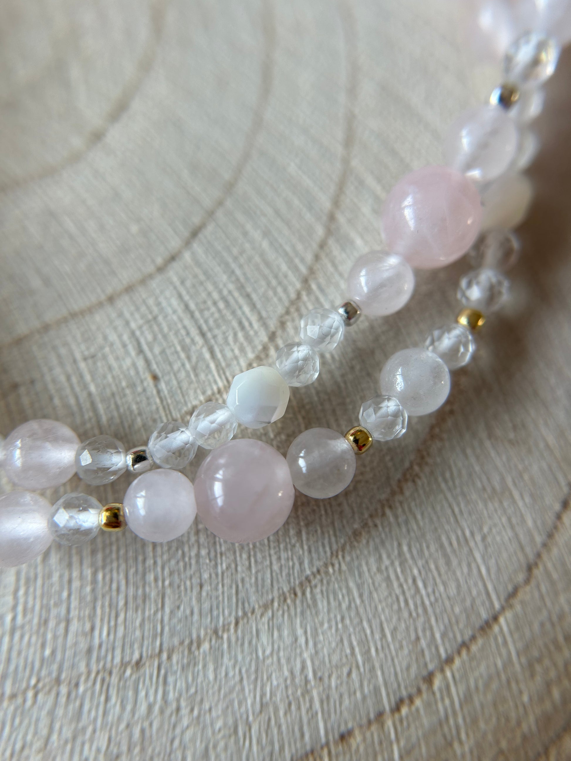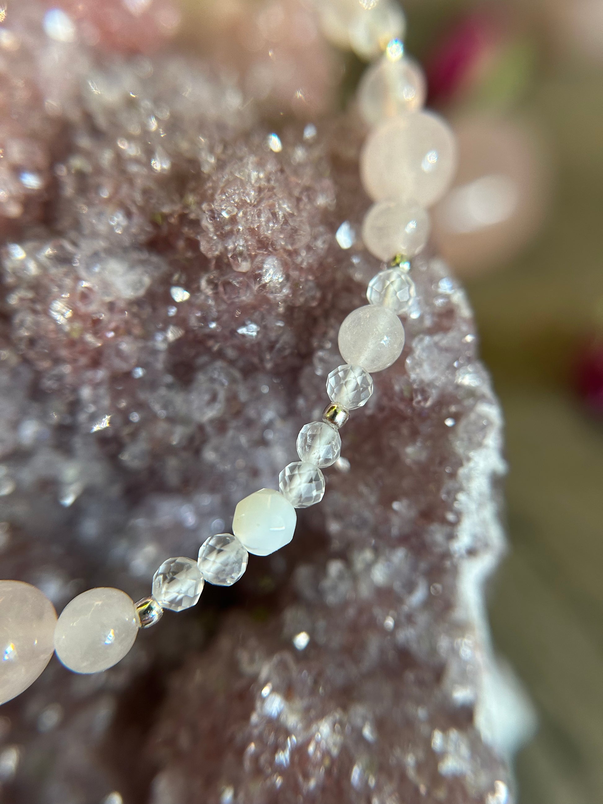 Material: facettierte Bergkristallperlen (3 mm), Rosenquarzperlen (3 mm und 6 mm), facettierte Perlmuttperlen (4 mm), kleine Perlen aus 925er Silber oder 925er Silber vergoldet