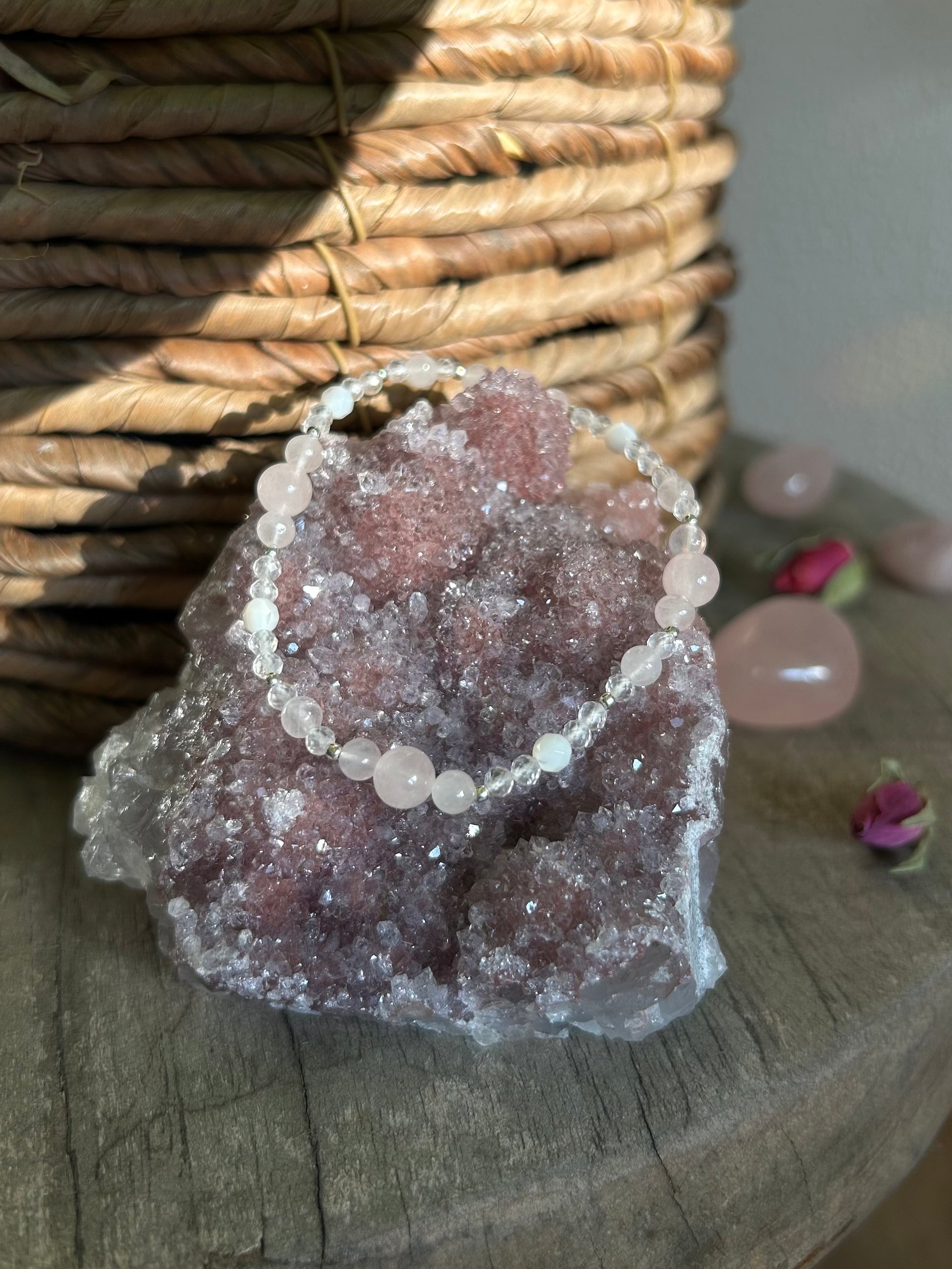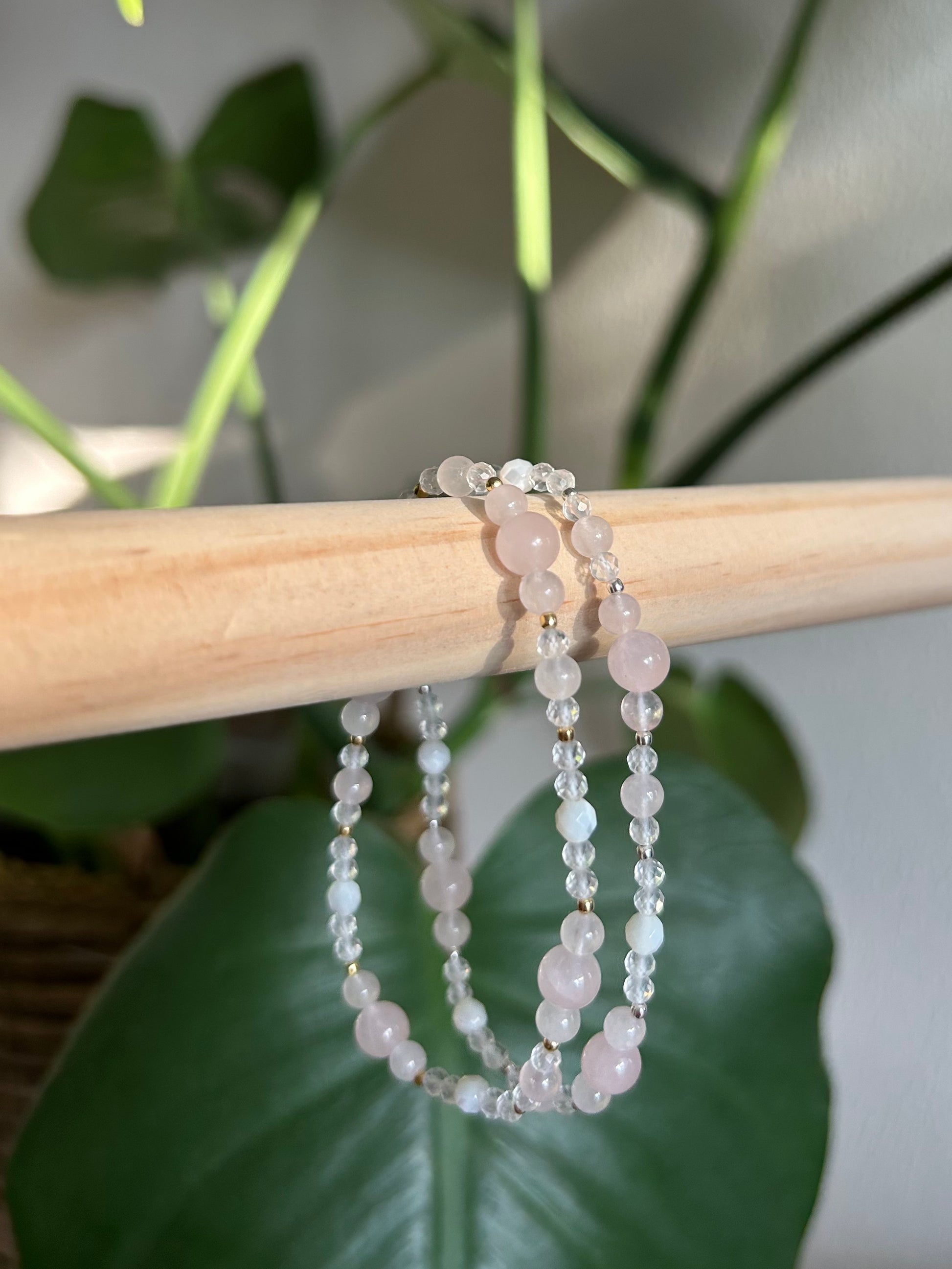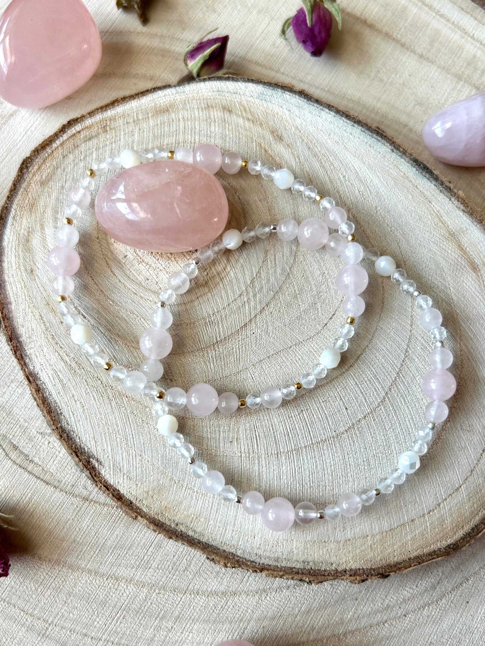 Material: facettierte Bergkristallperlen (3 mm), Rosenquarzperlen (3 mm und 6 mm), facettierte Perlmuttperlen (4 mm), kleine Perlen aus 925er Silber oder 925er Silber vergoldet