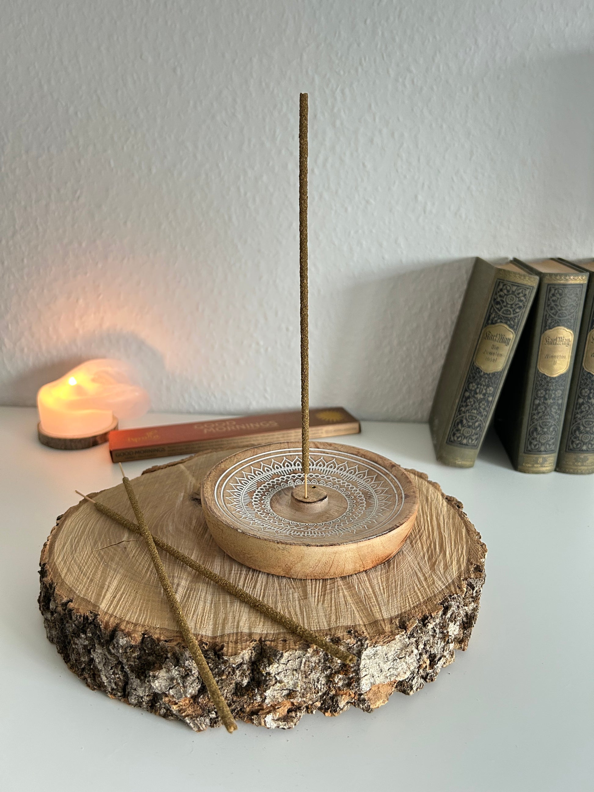 Anwendung: Das Räucherstäbchen anzünden, die Flamme ausblasen und auf ein geeignetes Räuchergefäß legen. Nach dem Räuchern gut lüften.