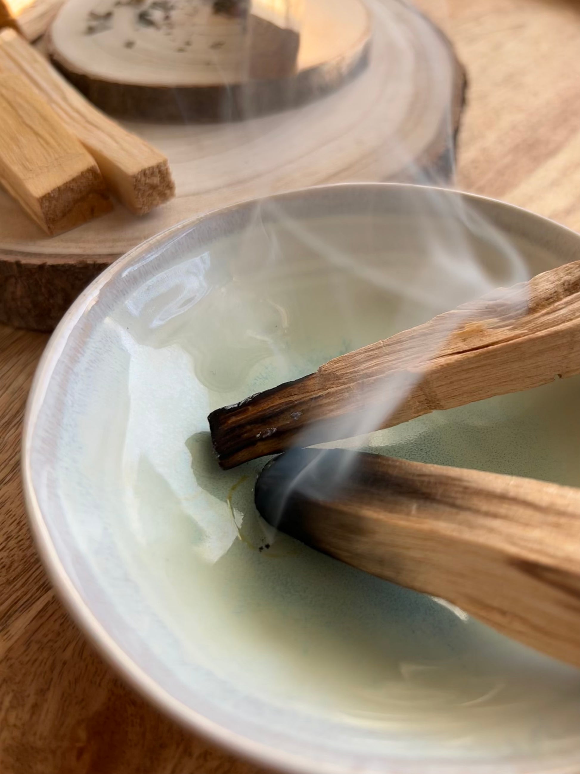 Anwendung: Ein Ende des Holzstücks anzünden, kurz brennen lassen und ausblasen, sodass es leicht schwelt. Den Rauch sanft im Raum oder um den Körper verteilen.
