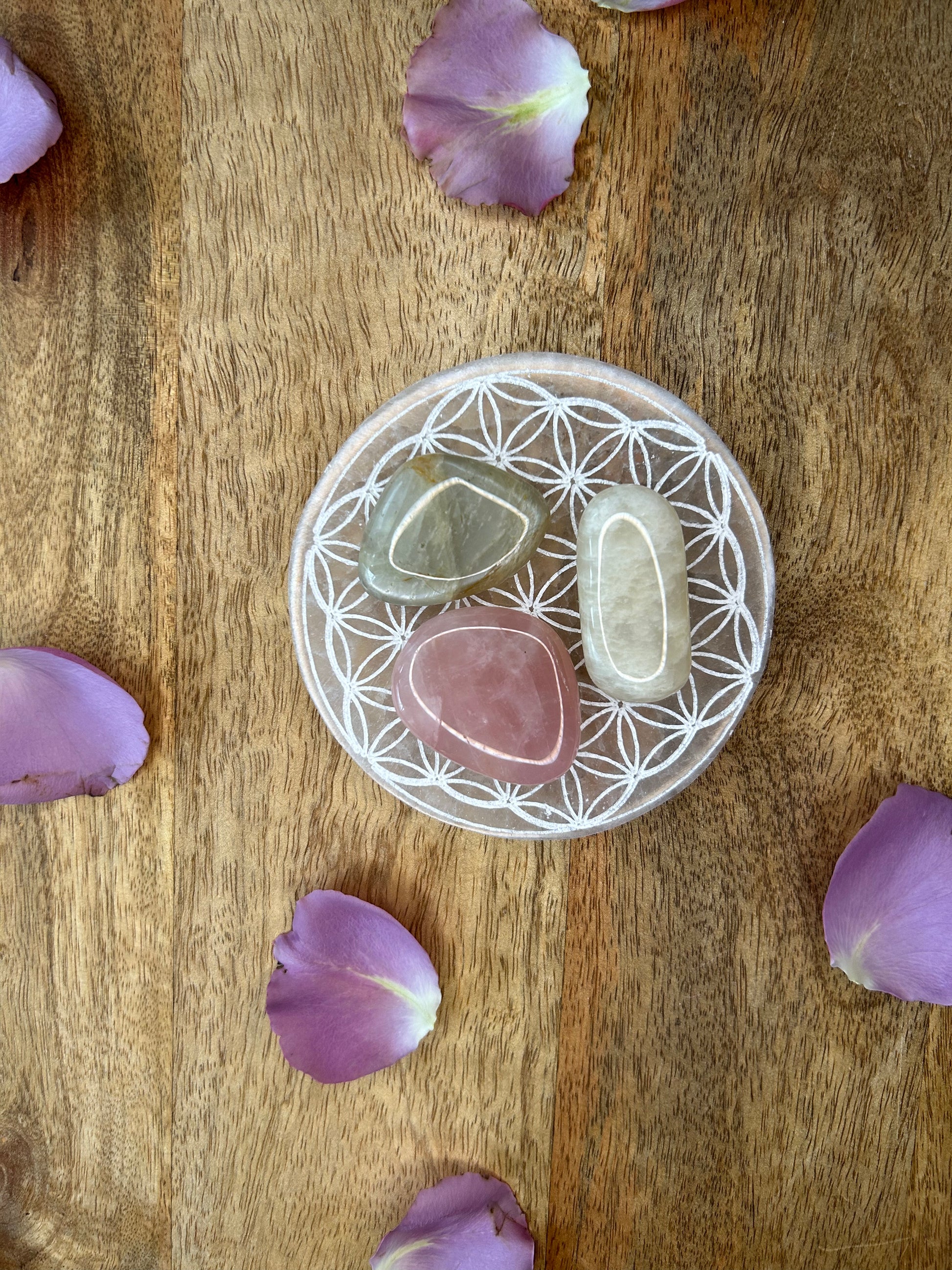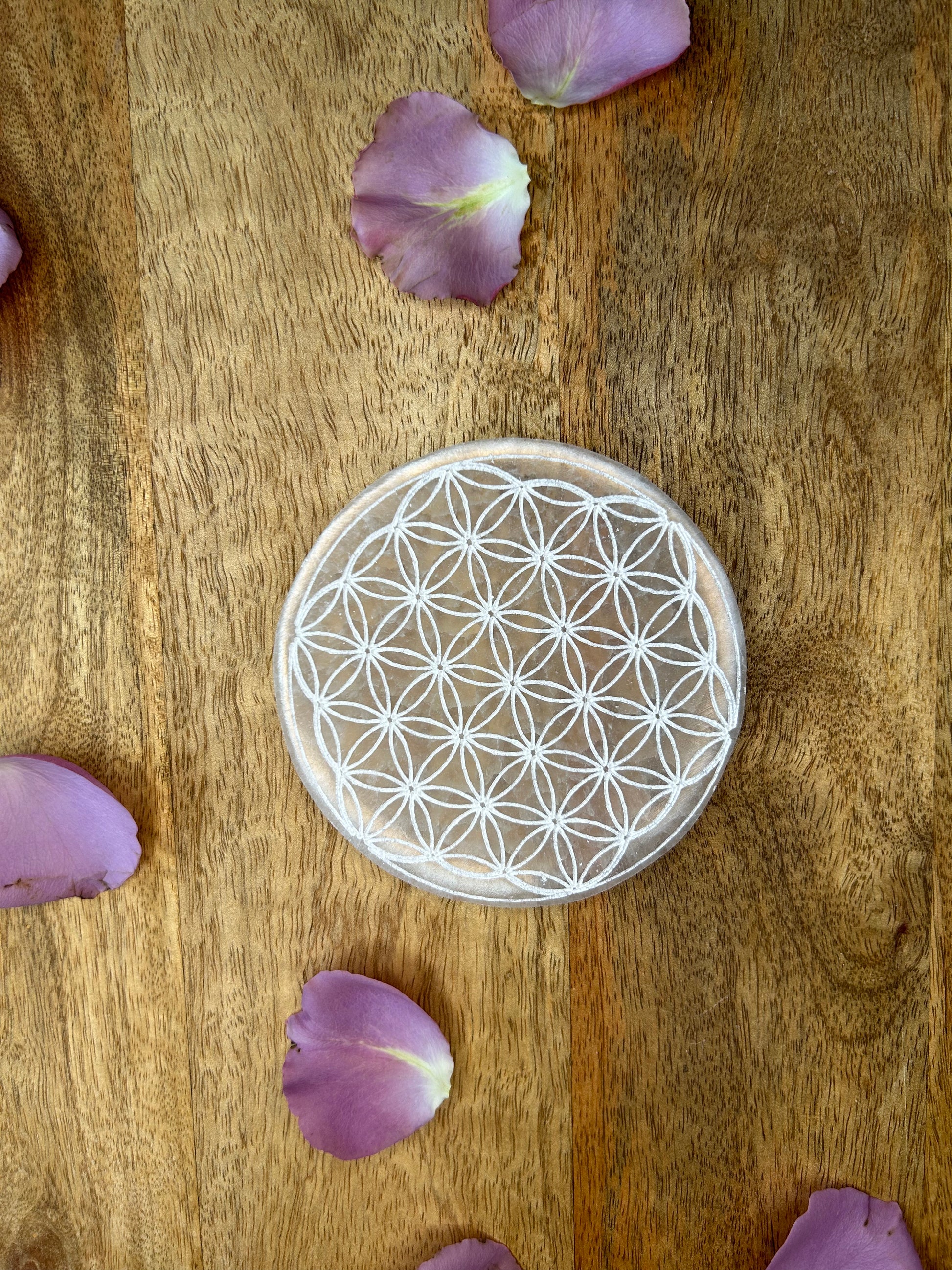Lege Deine Kristalle auf der Selenit-Ladeplatt ab, um sie energetisch zu reinigen.