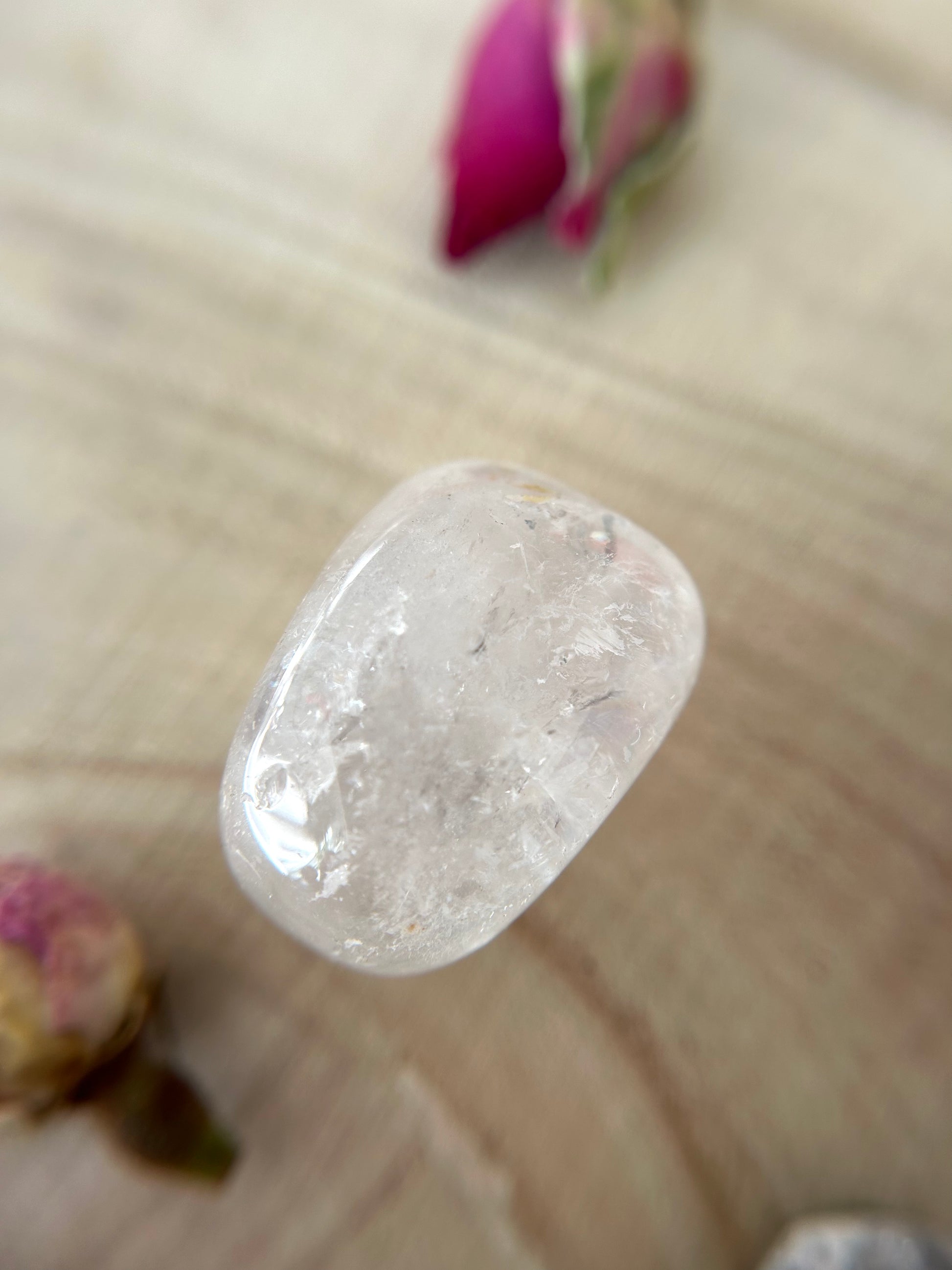 Bergkristall Trommelstein: Verstärkt die Energien der anderen Kristalle und hilft bei der Klarheit in der Partnerschaft.