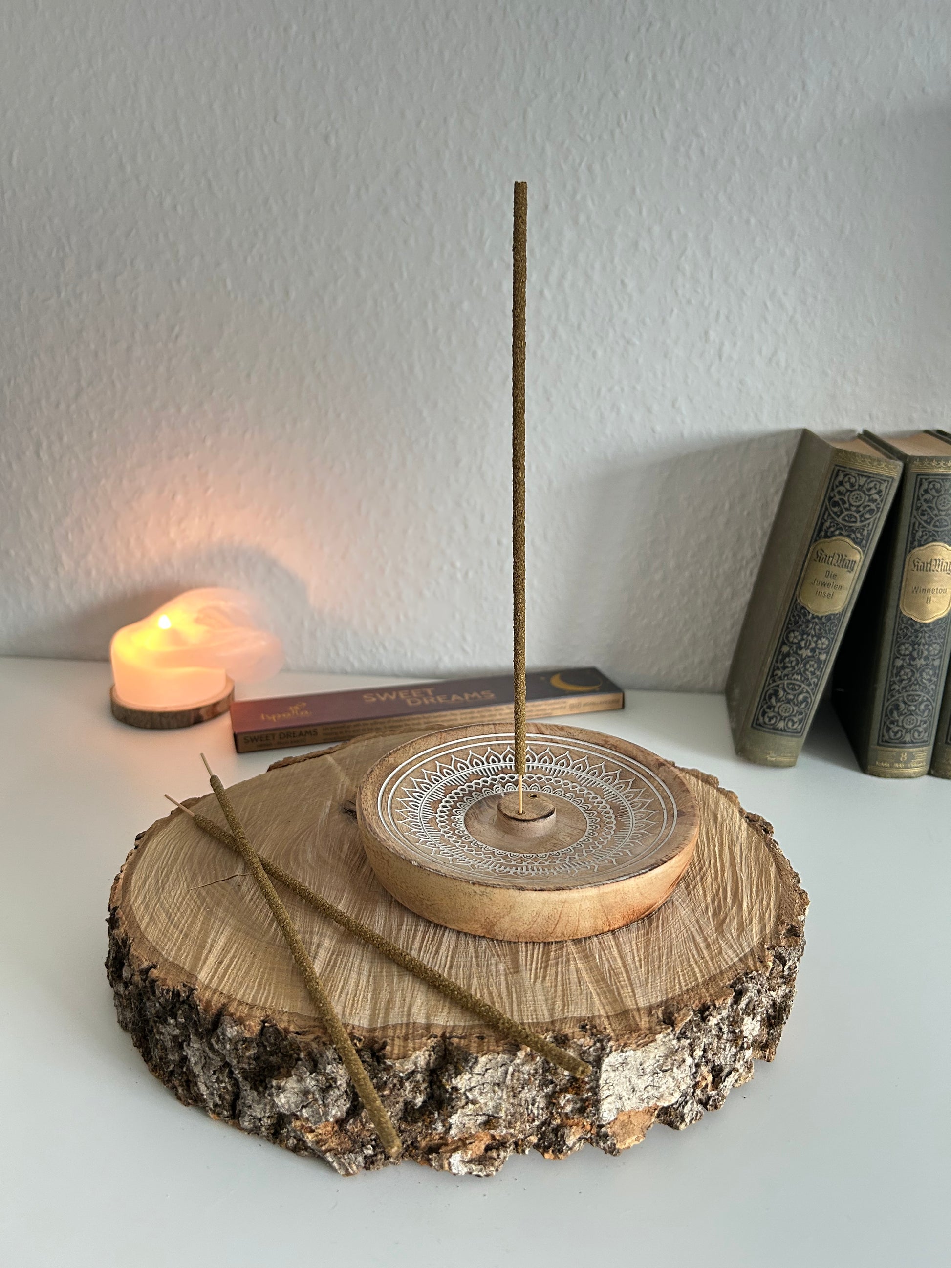 Anwendung: Das Räucherstäbchen anzünden, die Flamme ausblasen und auf ein geeignetes Räuchergefäß legen. Nach dem Räuchern gut lüften.