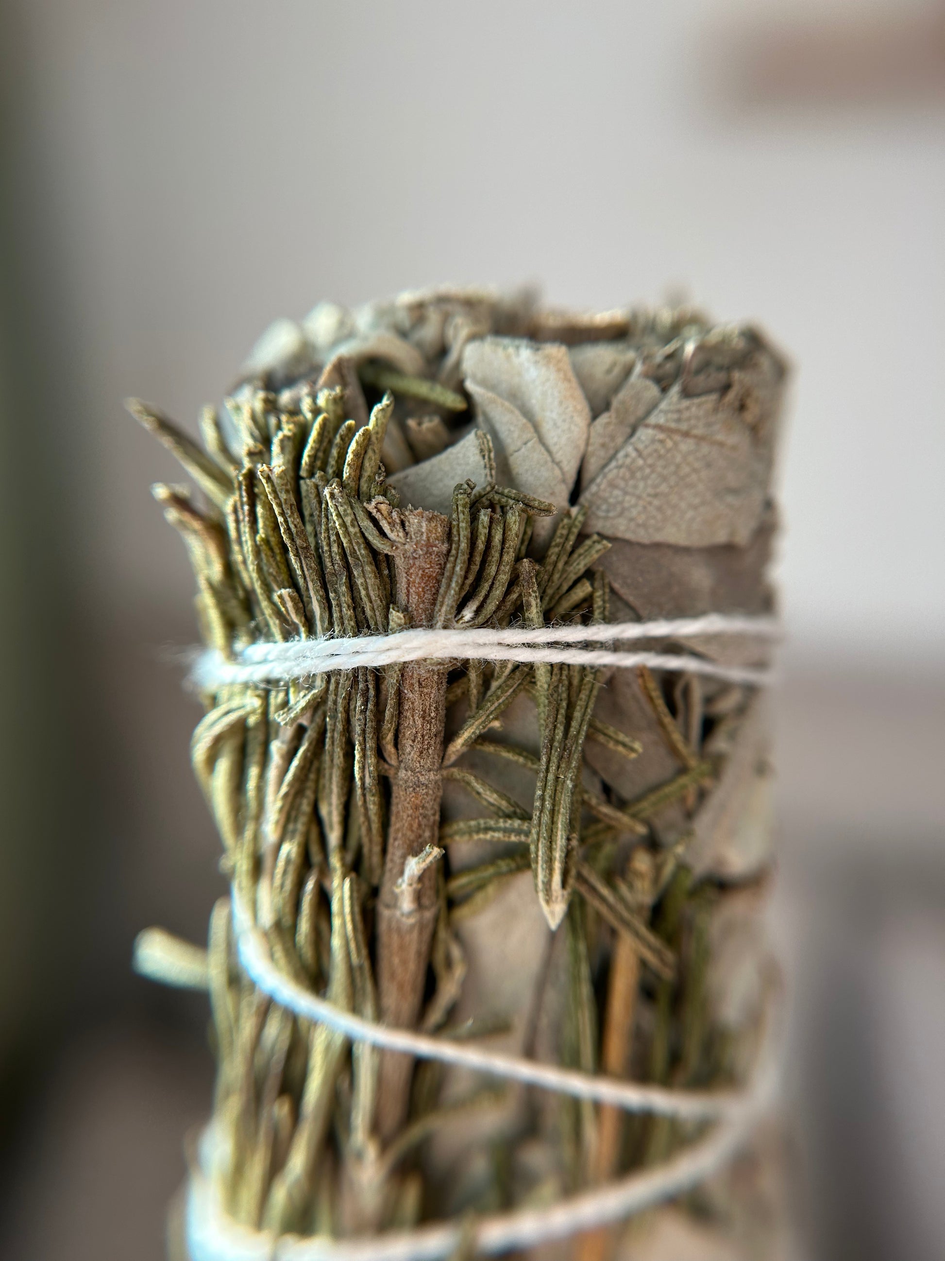 Unser Räucherbündel aus weißem Salbei und Rosmarin vereint die klärende Energie des weißen Salbeis mit der schützenden und belebenden Kraft des Rosmarins. Weißer Salbei wird traditionell für die energetische Reinigung von Räumen und Auren genutzt, während Rosmarin für eine erdende, schützende Energie sorgt und Klarheit bringt. Gemeinsam schaffen sie eine harmonische Atmosphäre, die negative Energien entfernt und den Geist stärkt.