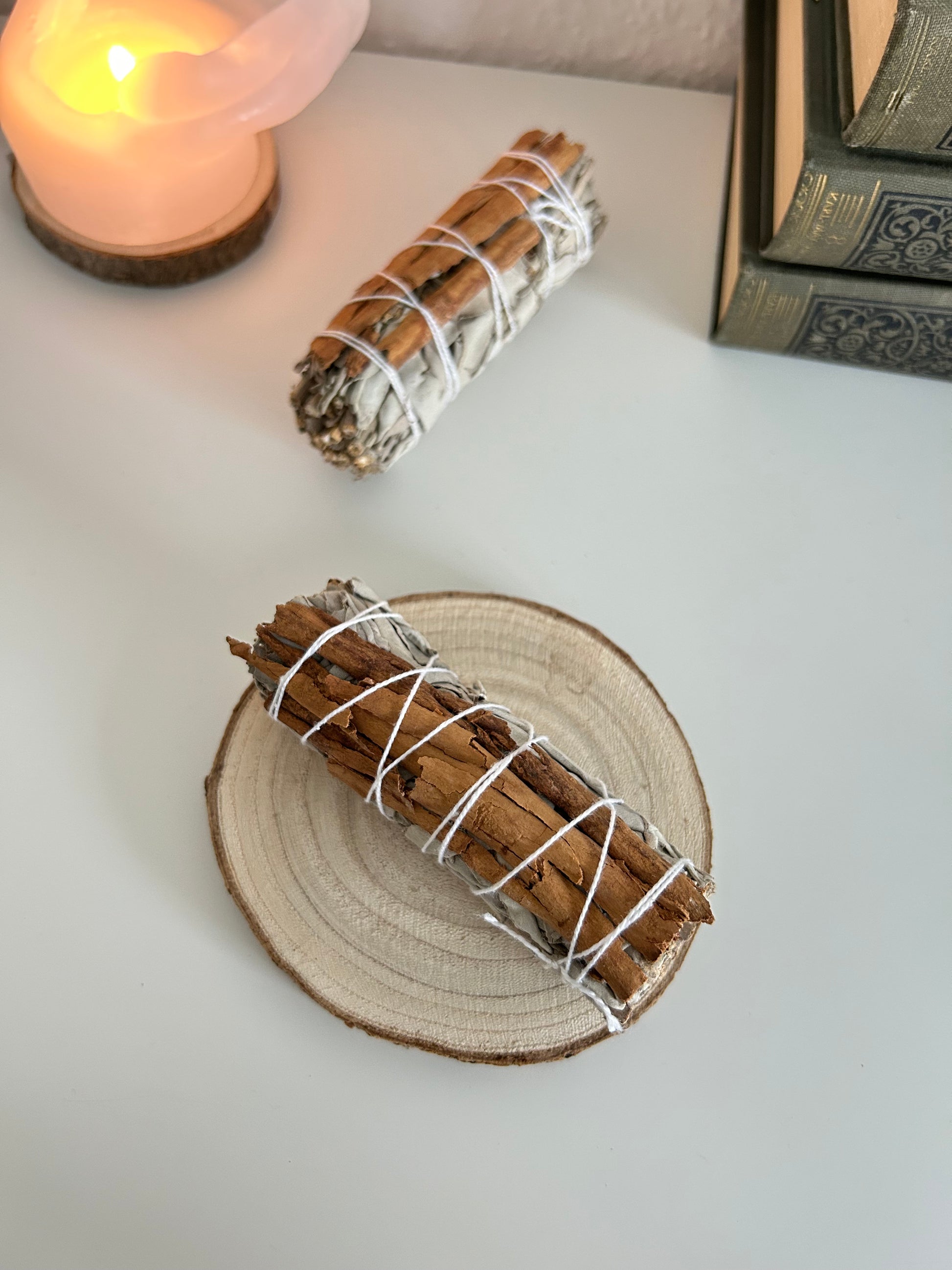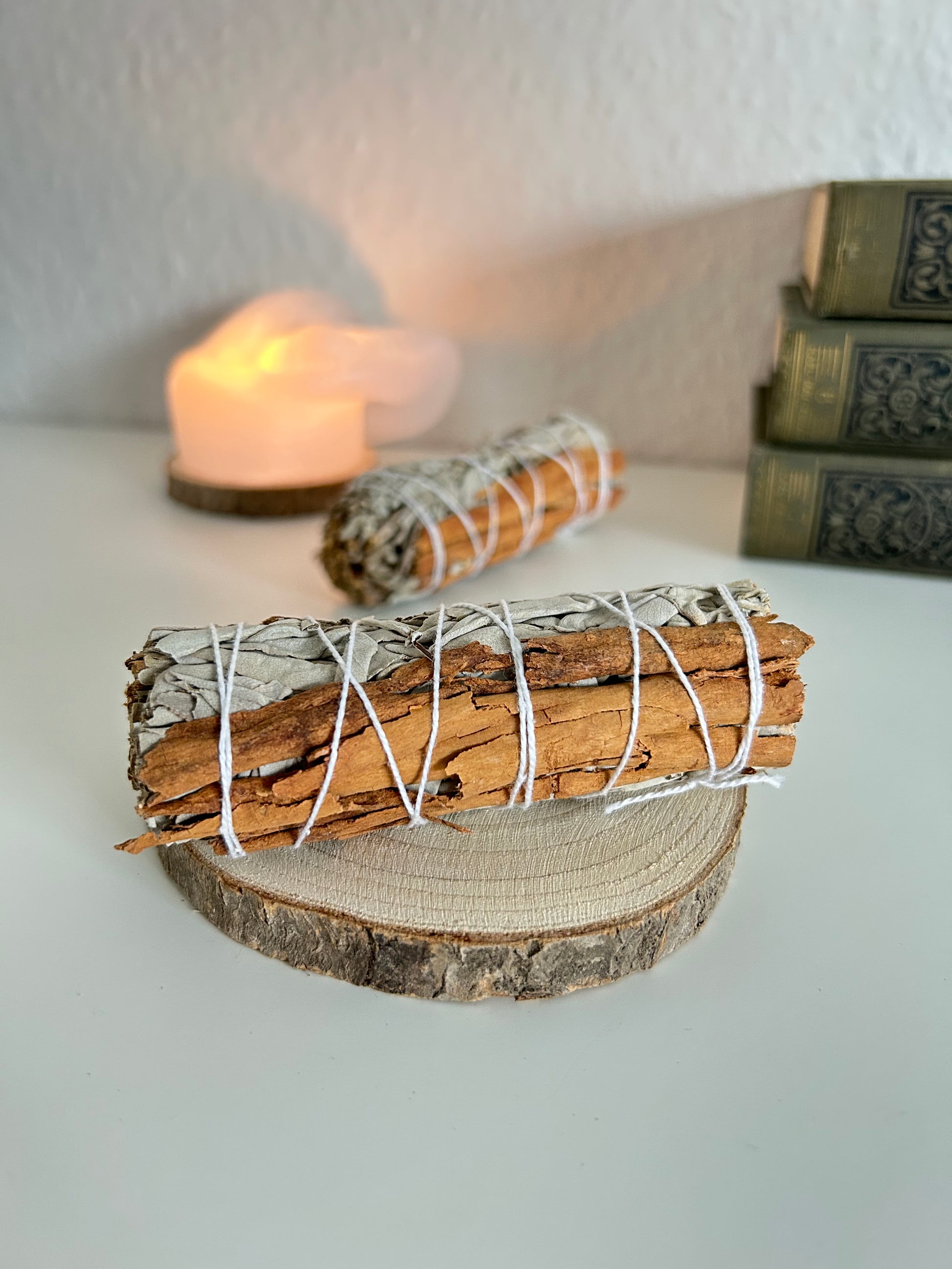 Unser Räucherbündel aus weißem Salbei und Zimt verbindet die stark reinigende Kraft des weißen Salbeis mit der wärmenden, aktivierenden Energie des Zimts. Weißer Salbei wird traditionell zur energetischen Reinigung von Räumen und Auren eingesetzt, während Zimt für Schutz, Vitalität und eine belebende Atmosphäre steht. Gemeinsam erzeugen sie einen würzig-warmen Duft, der stagnierende Energien löst, neue Kraft freisetzt und Mut sowie Lebensfreude fördert.
